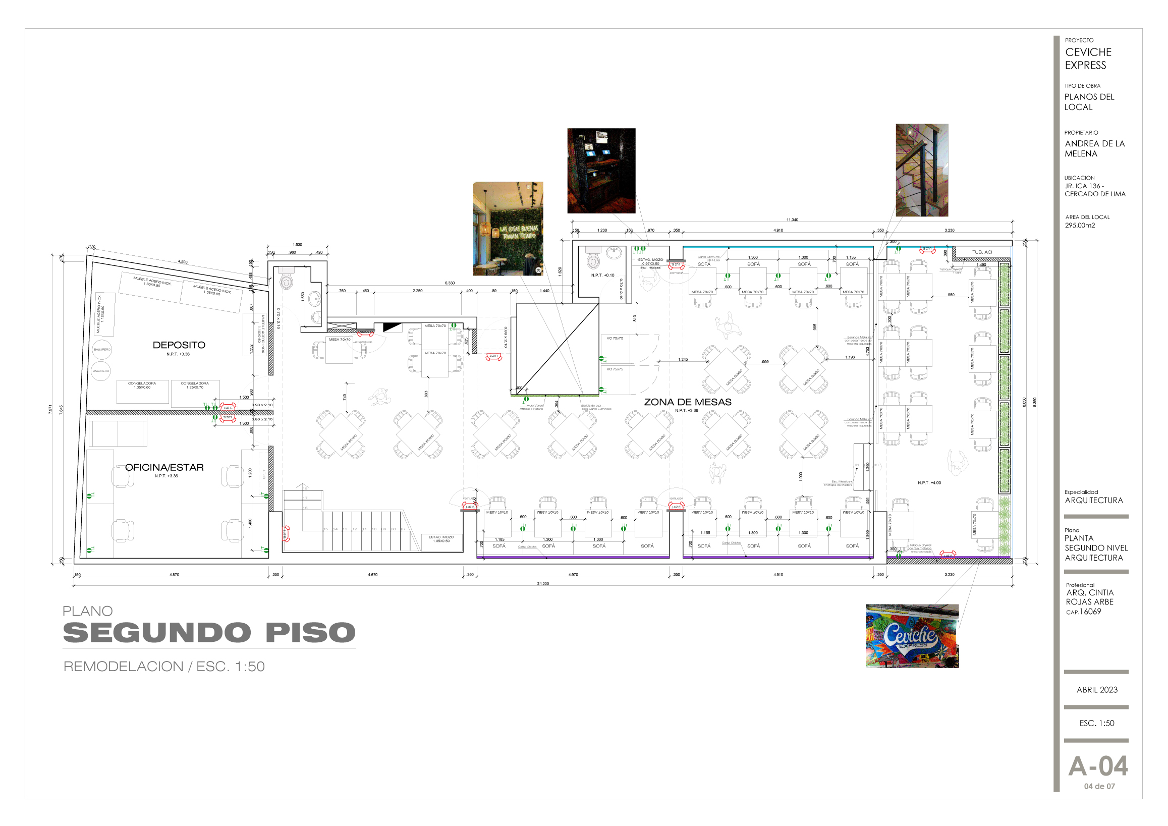Diseño para ampliación y remodelación de local de 295.00 m2 para cadena de restaurantes Ceviche Express. Desarrollo de arquitectura e inst. eléctricas y diseño interior.