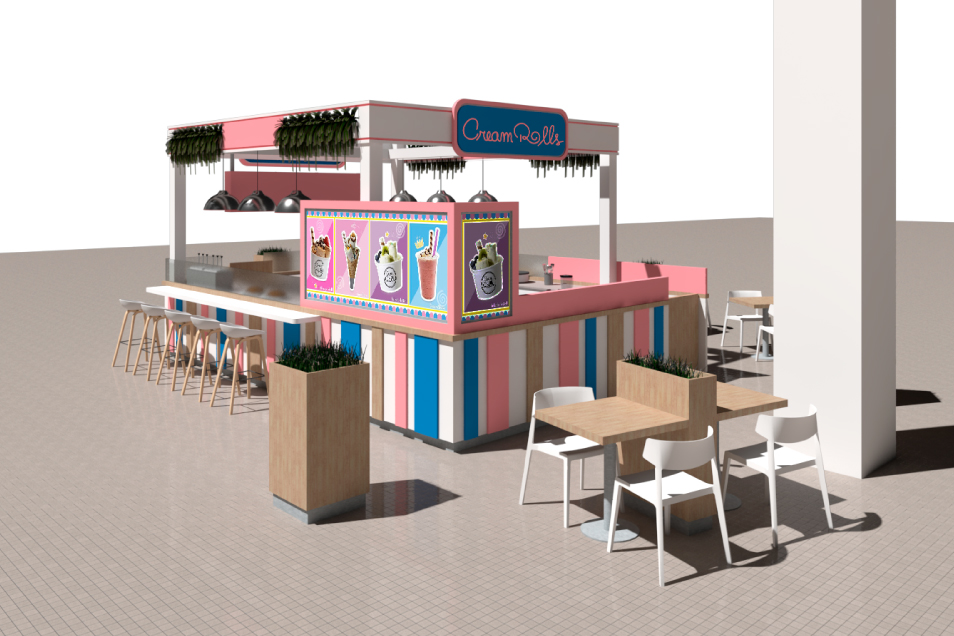 Modulo para venta de helados y papas fritas de la marca Cream Rolls en C.C. Mall Aventura Plaza Comas.
